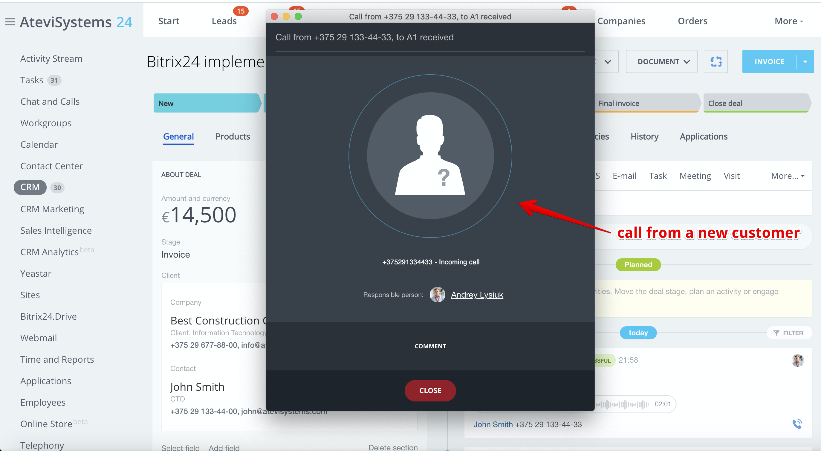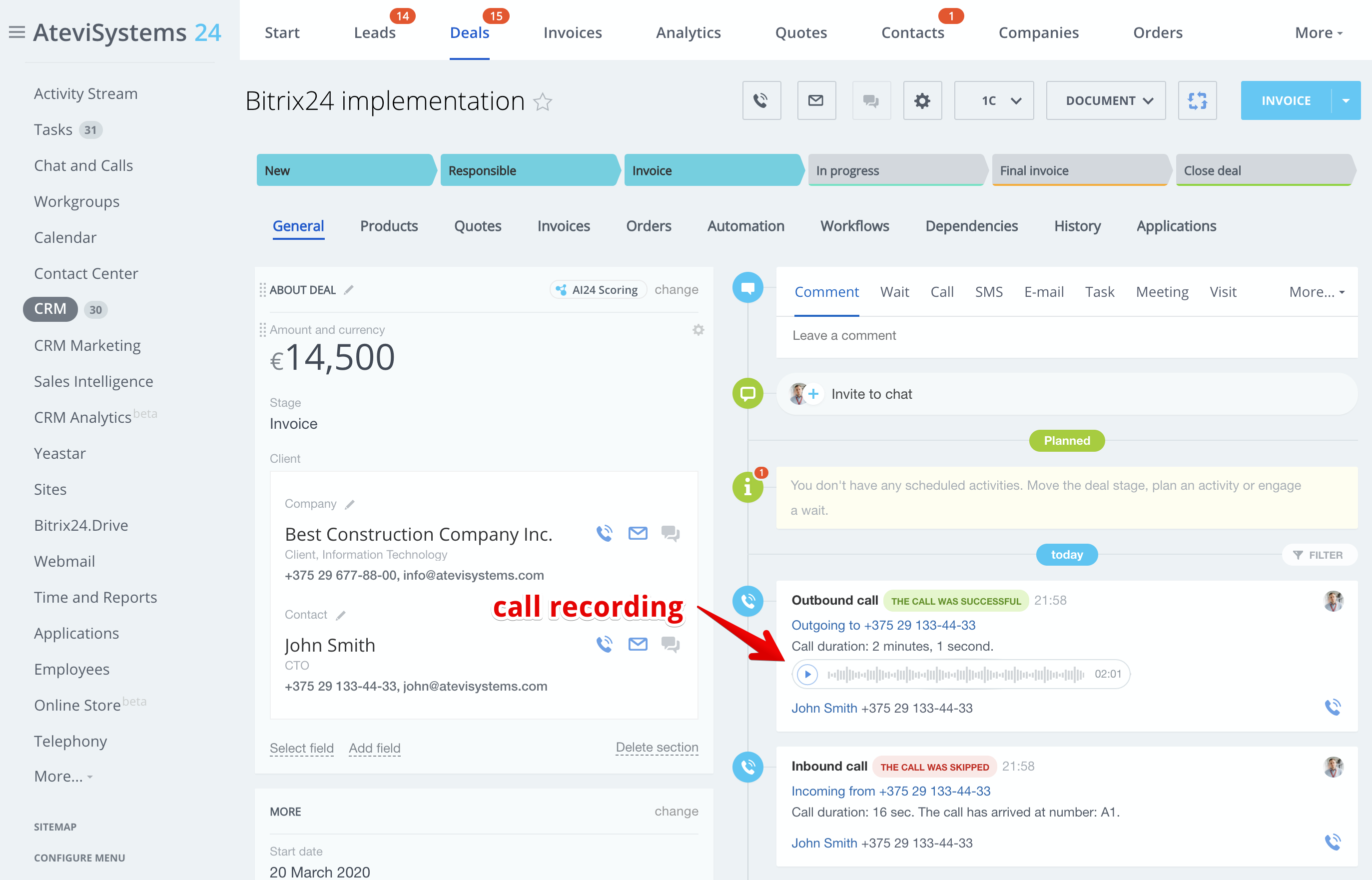 - Outbound call by clicking on the phone number in CRM