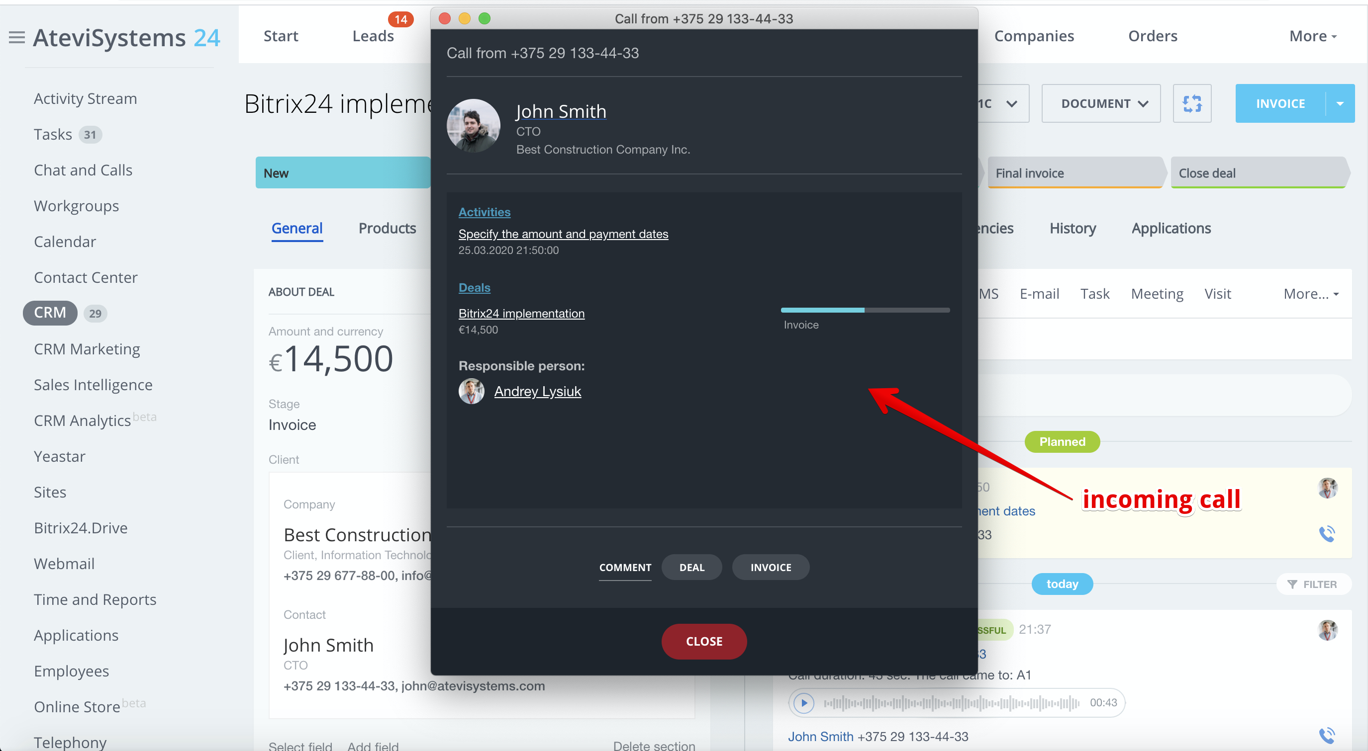 - Outbound call by clicking on the phone number in CRM