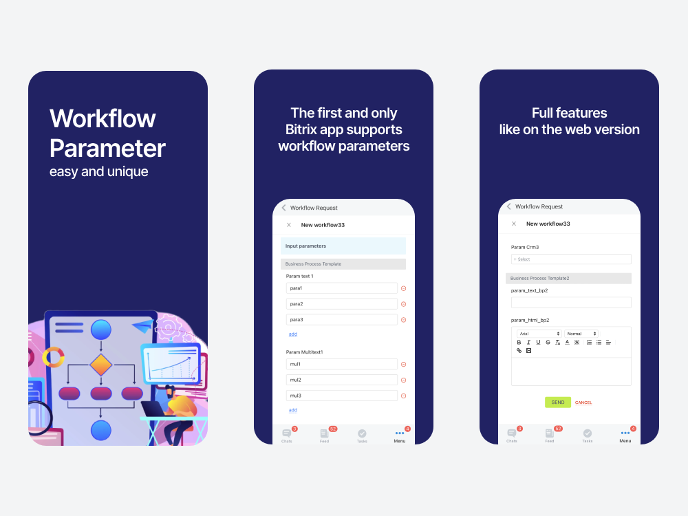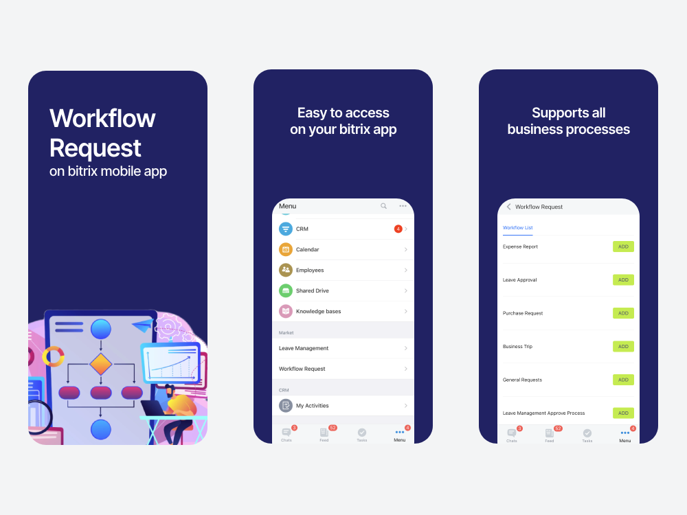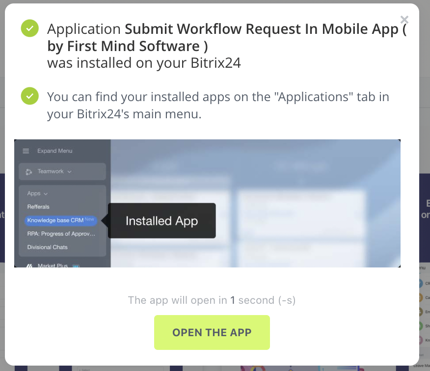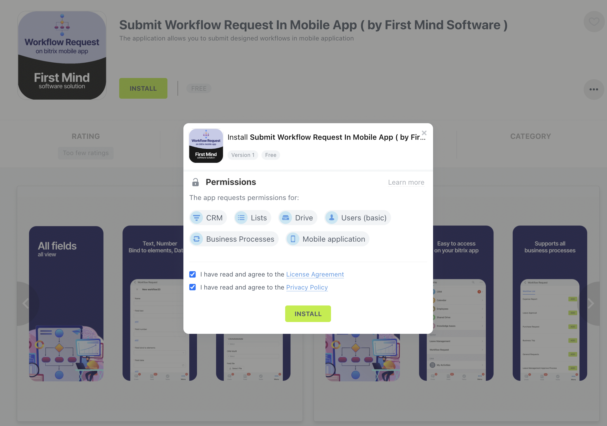 After successful installation, the end-user opens Bitrix24 mobile application -> Menu -> Market -> First Mind Workflow Creation. The system will load up all workflows with properly granted permissions for current login account.