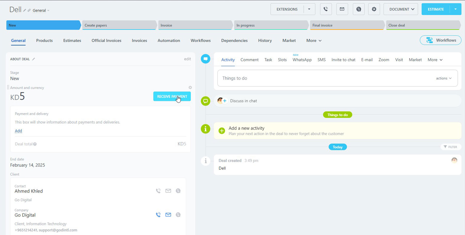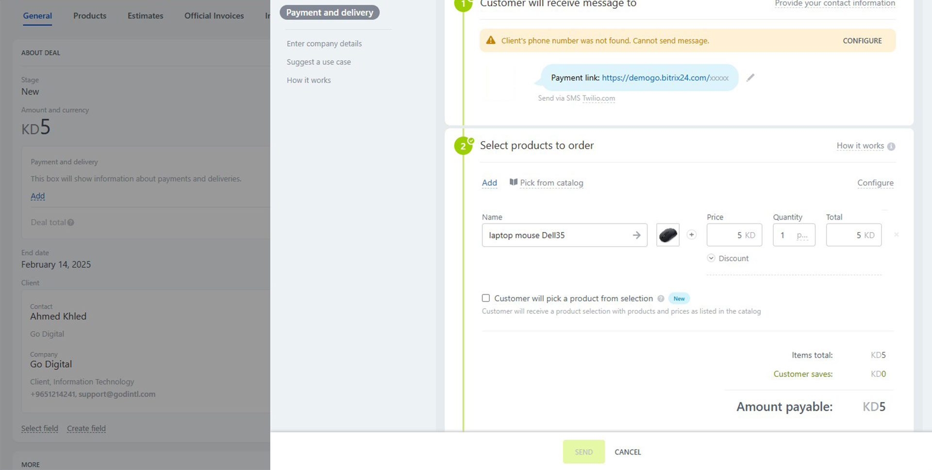 Payment Link Generation: Generates payment links from deals, invoices, online stores, and CRM forms within Bitrix24. These links can be sent to clients via SMS, WhatsApp, or other messengers.