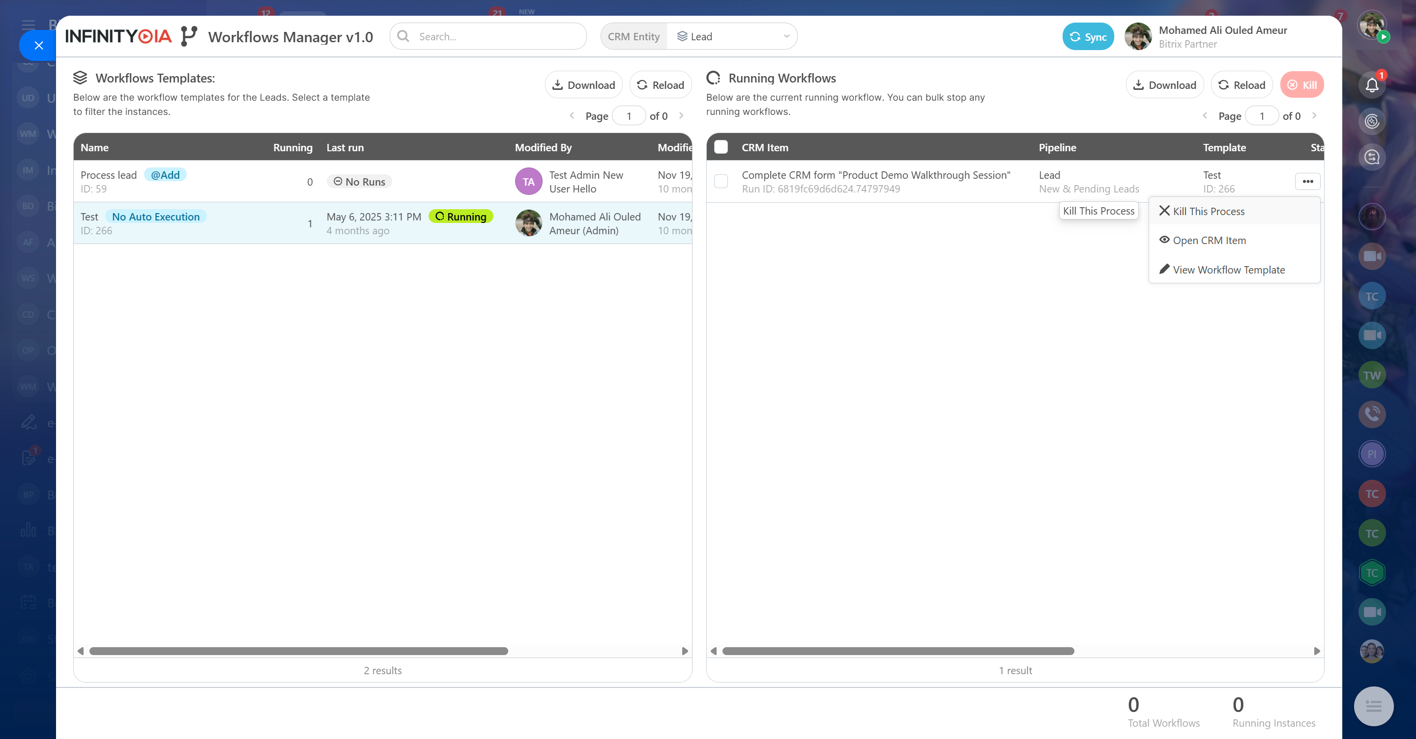 Easily manage Bitrix24 workflows with full visibility into templates and running instances. Monitor, control, and stop workflows to keep your CRM automation clean and efficient.