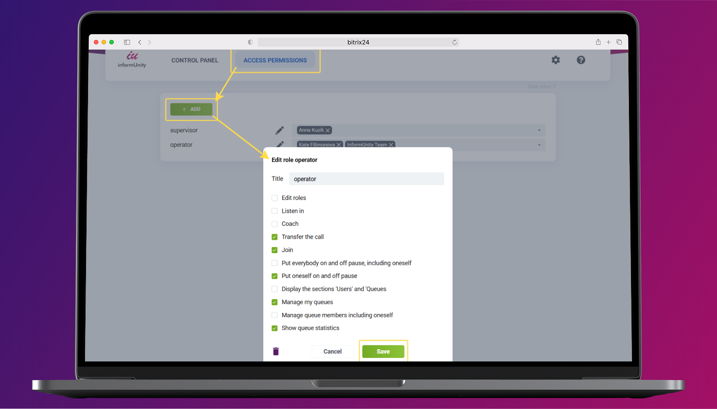Flexible rights management: you can create roles (e.g. Admin, Supervisor, Agent) and set access rights for each one so they have access only to the necessary tools.