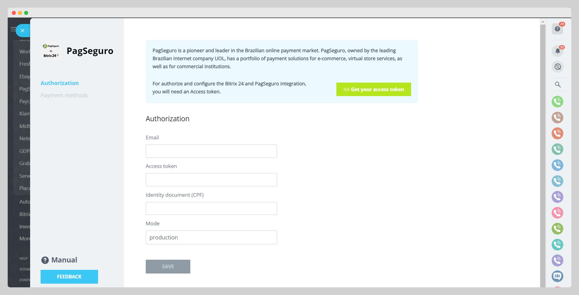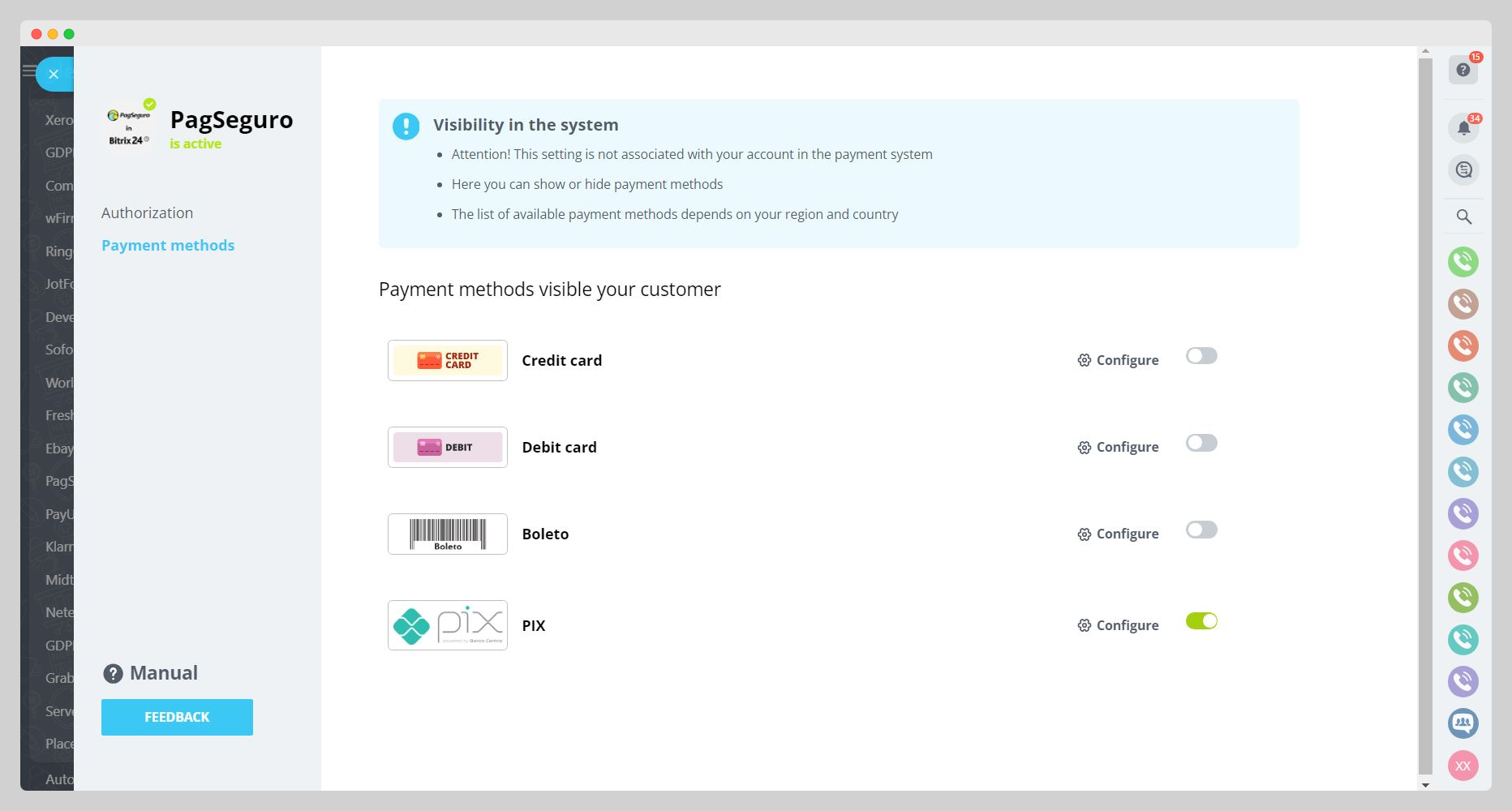 Your customers can pay for invoices, deals and orders via PagSeguro.