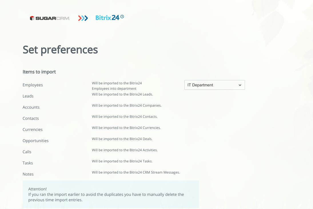 Once you start importing SugarCRM data, the process cannot be paused or stopped until entirely finished. Please, make sure that you have provided all the required information before starting migration.