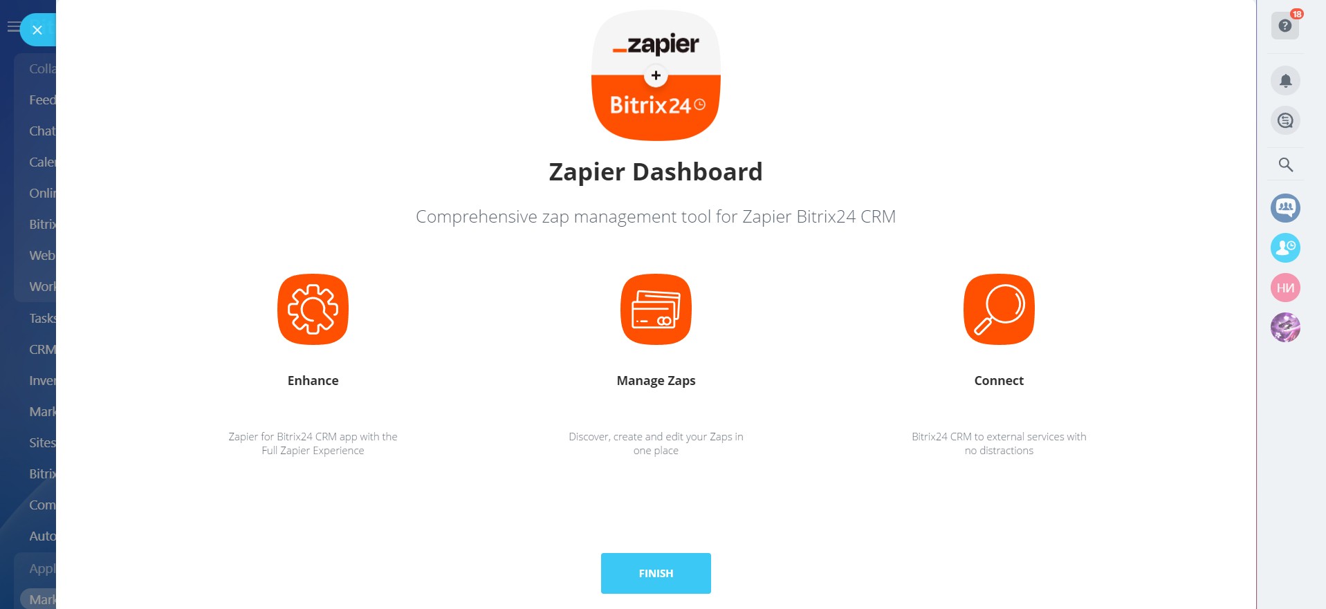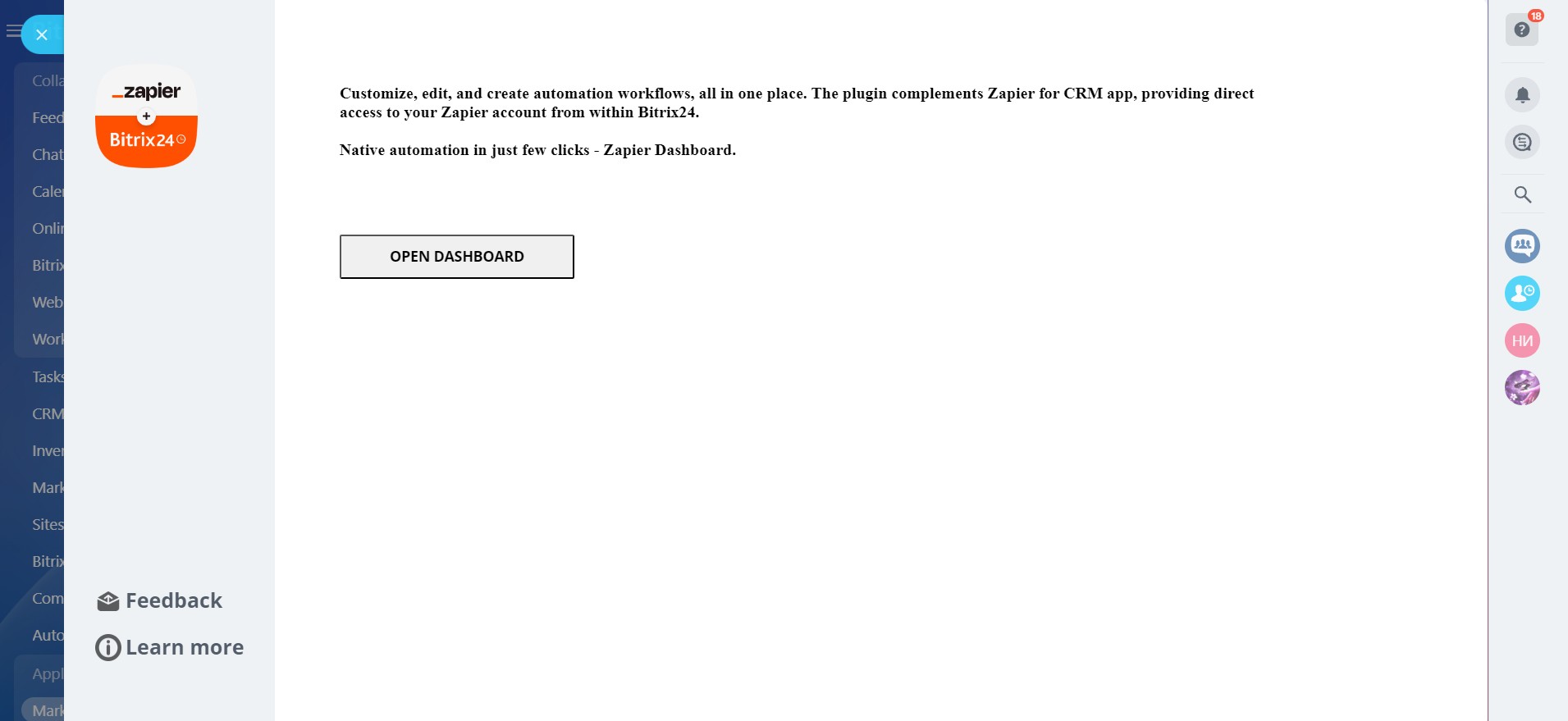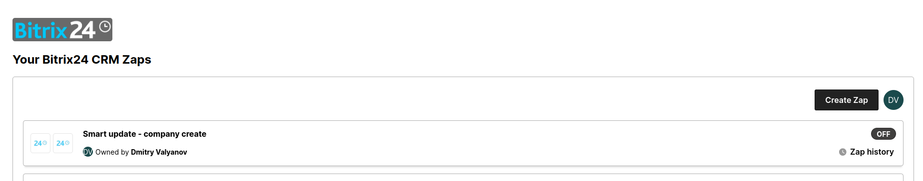 The Zapier Dashboard is a valuable addition to the Zapier for CRM app, as it allows you to conveniently access your Zapier account directly from within Bitrix24.