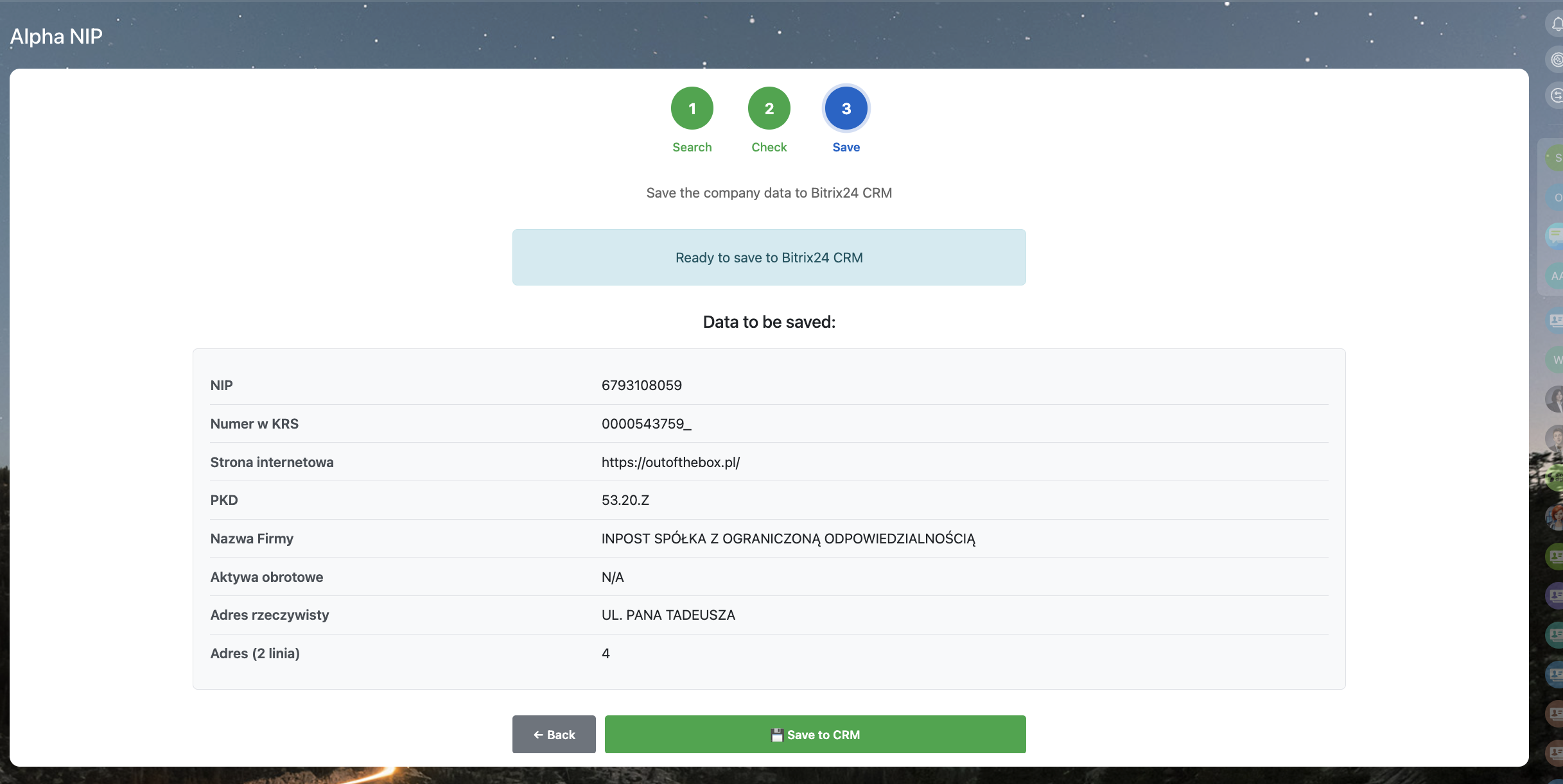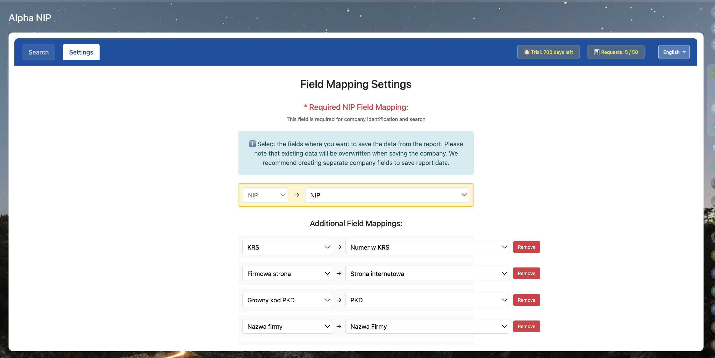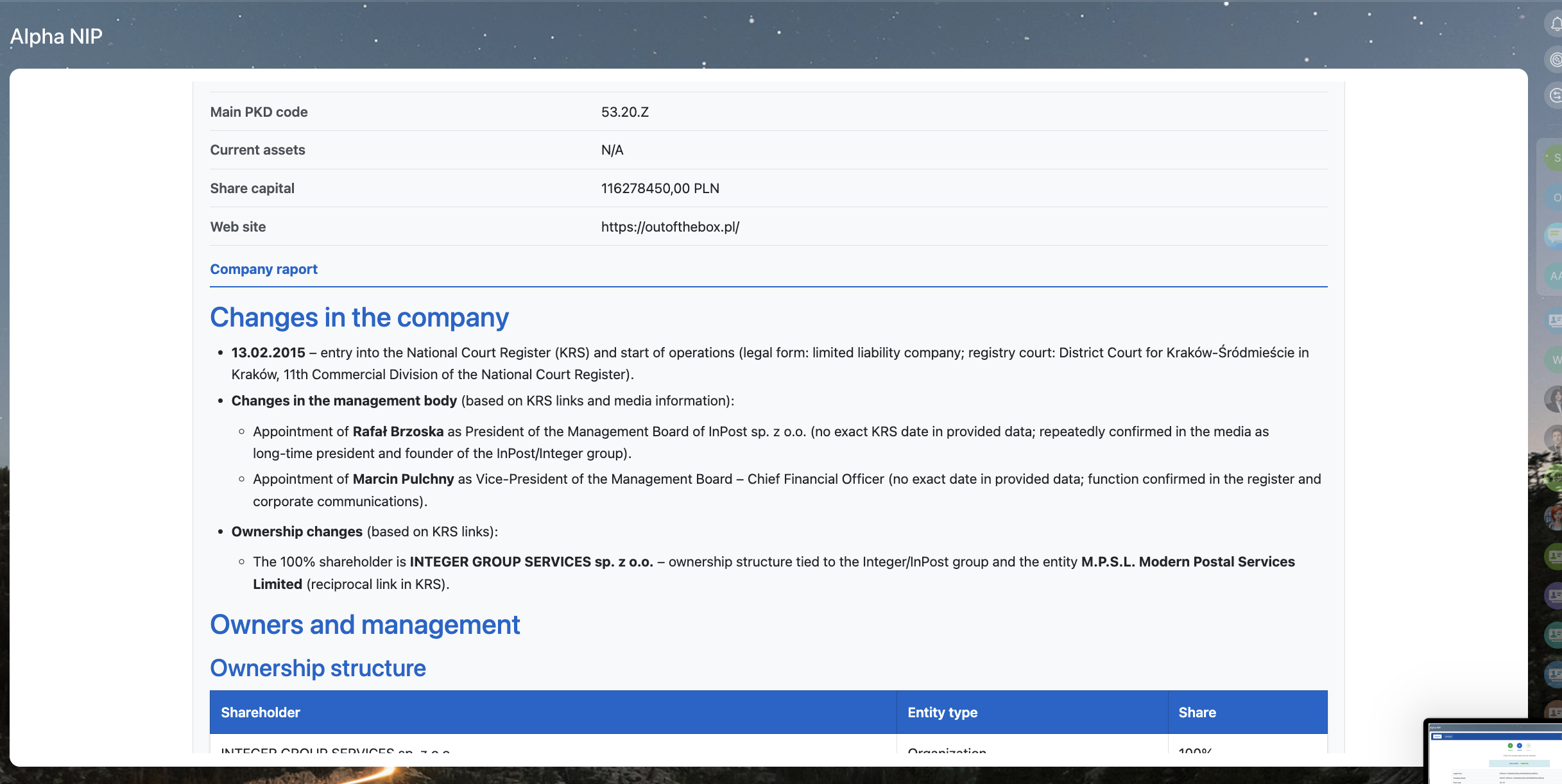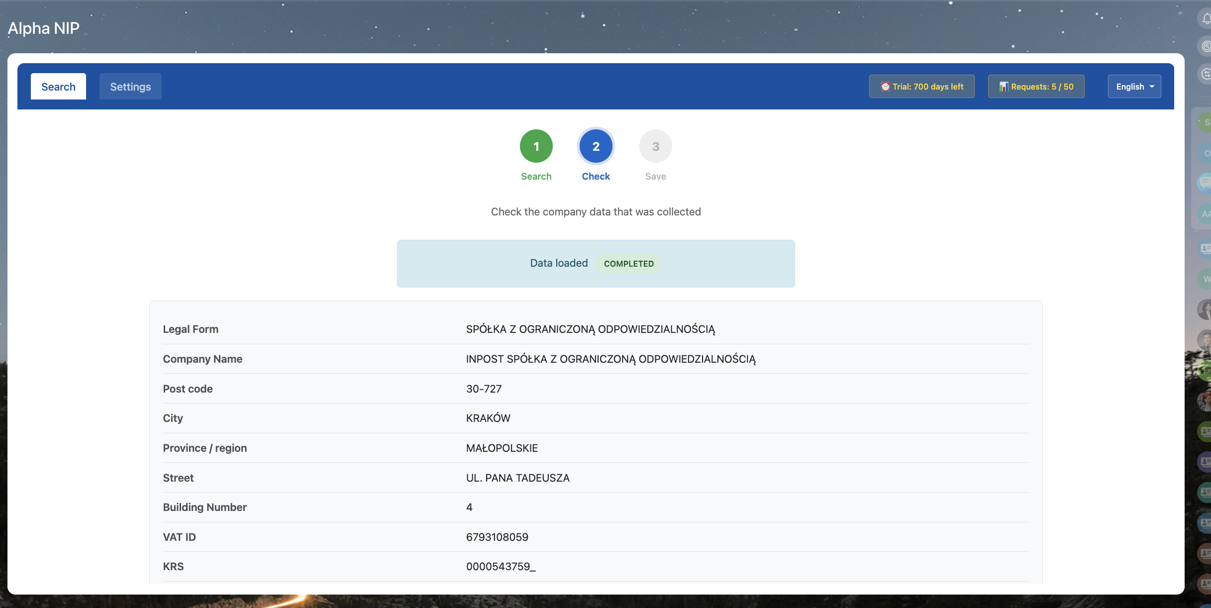 AlphaNIP+AI automatically collects company info based on NIP
