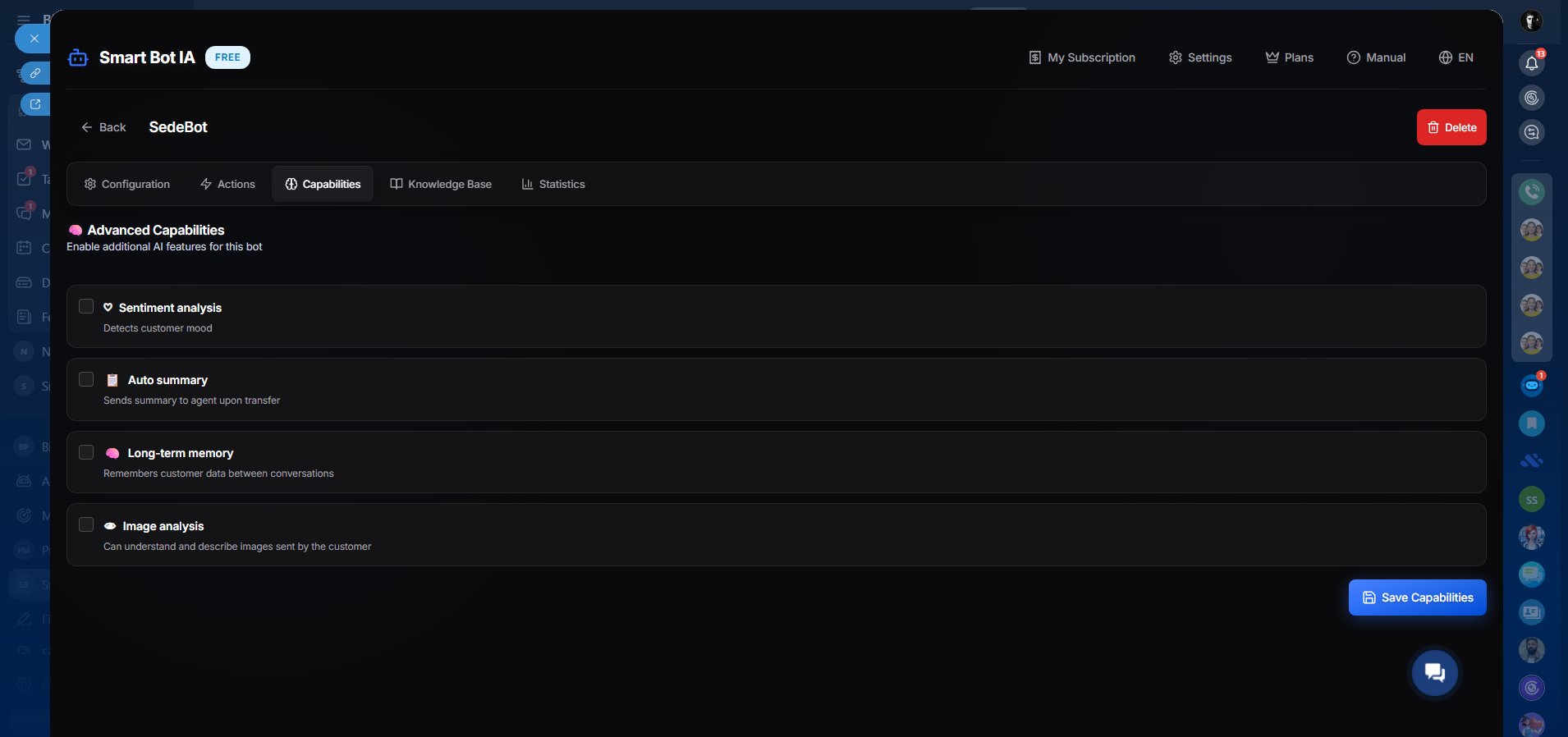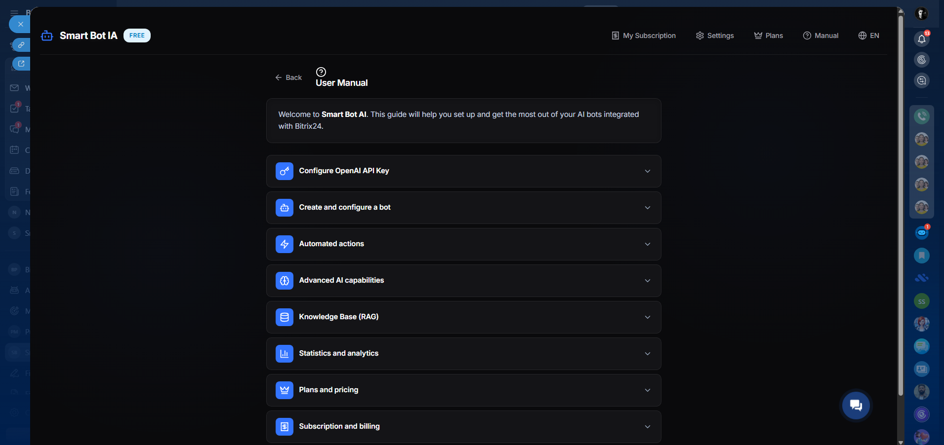 SmartBot IA is a powerful Artificial Intelligence assistant that automates your customer support 24/7 without leaving Bitrix24. It reduces your human agents' workload by responding precisely and naturally in your Open Channels.