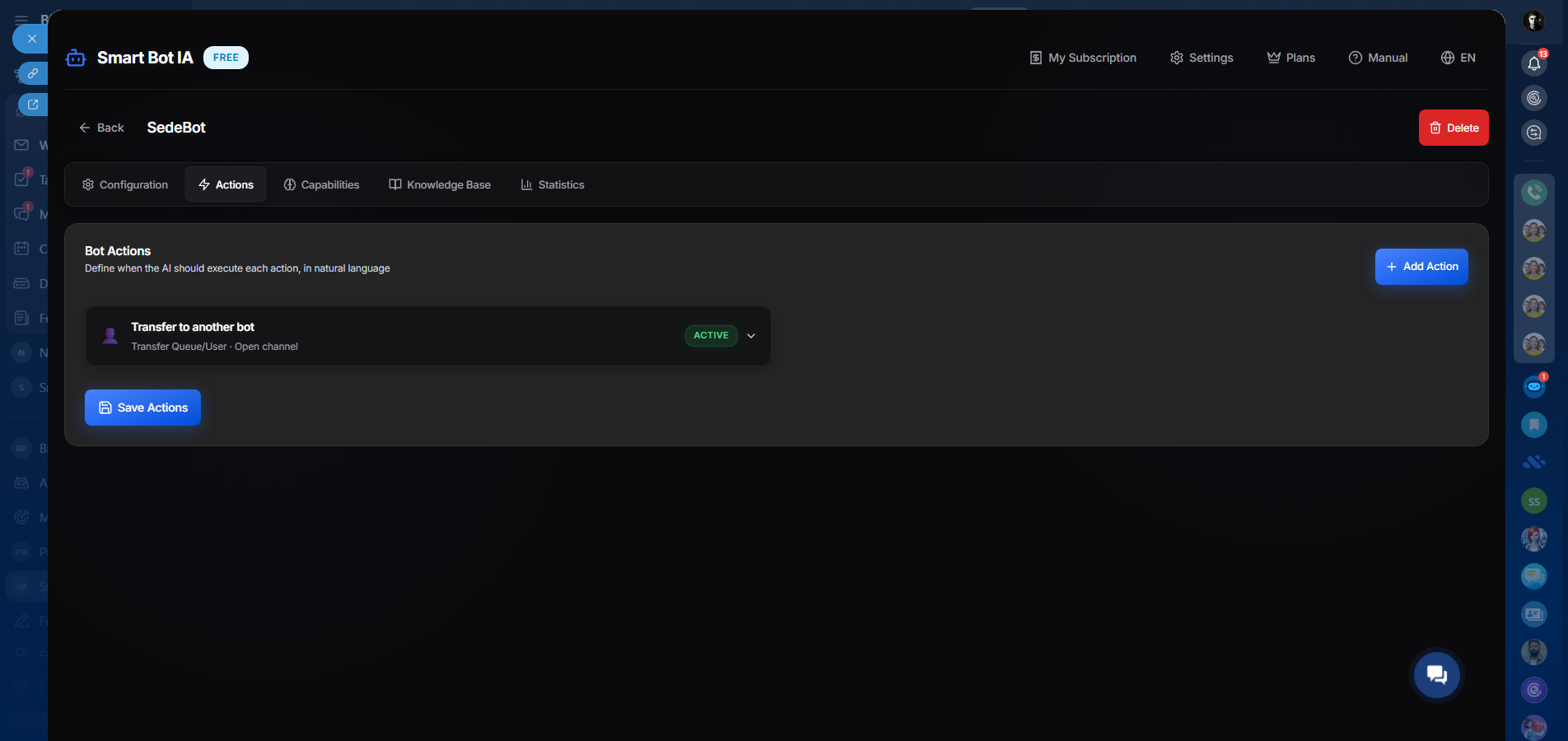 - Advanced CRM Actions: SmartBot doesn't just chat; it executes tasks. It can transfer conversations to a human, Create Tasks, Collect customer data before routing, and Create Leads in the CRM.