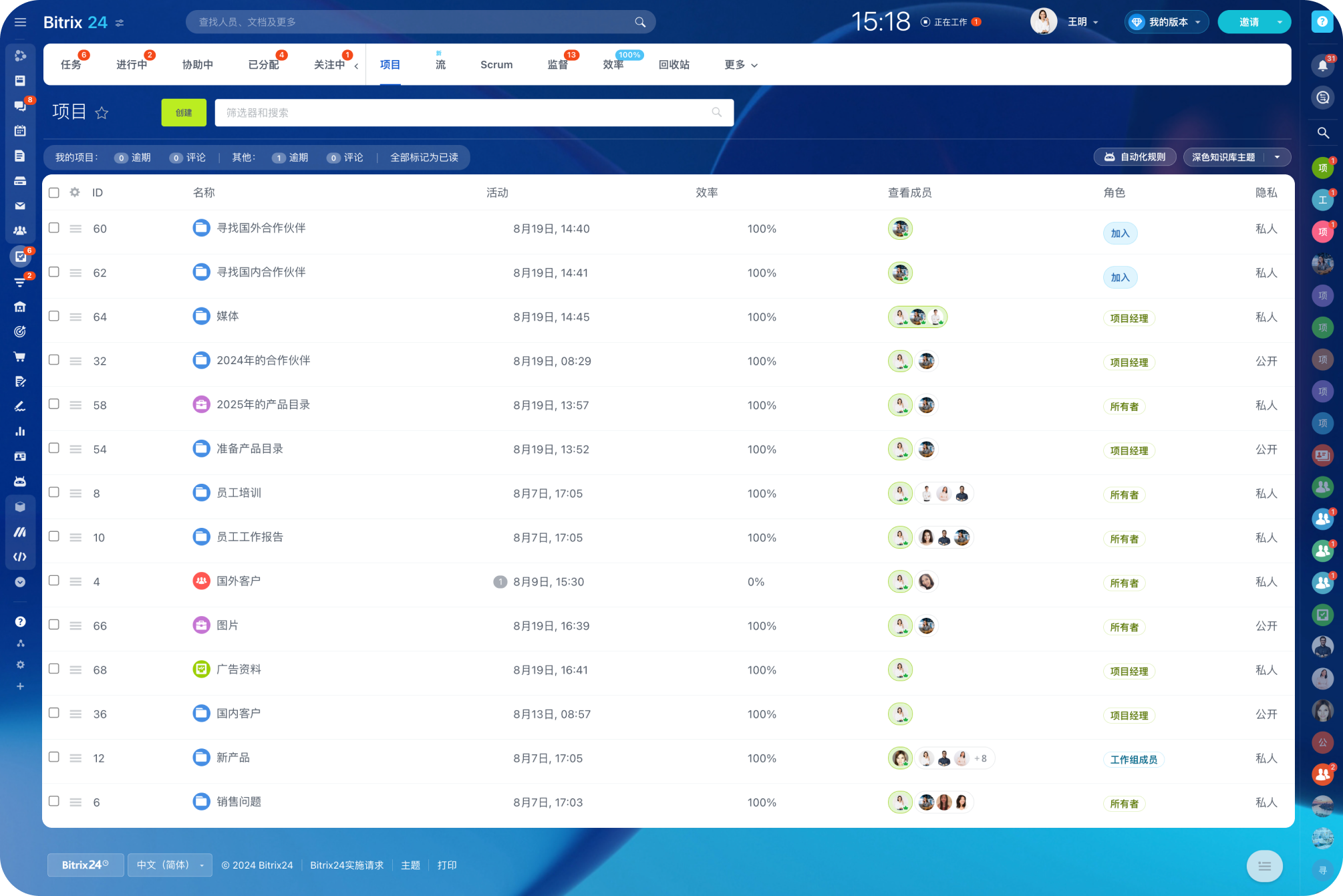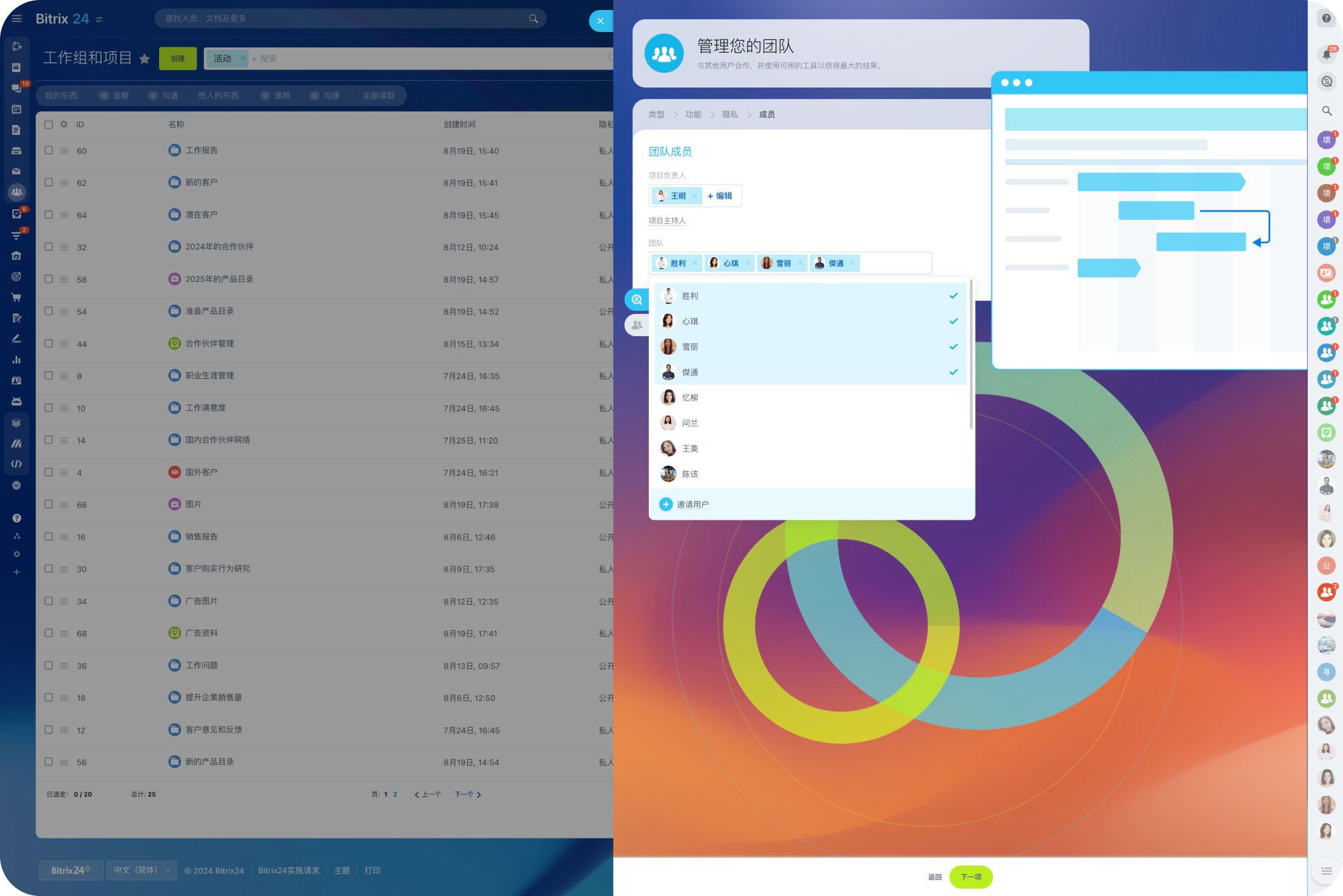 在 Bitrix24 在线工作空间软件中设置项目非常简单。 只需添加团队成员,设置访问权限,然后开始工作!
