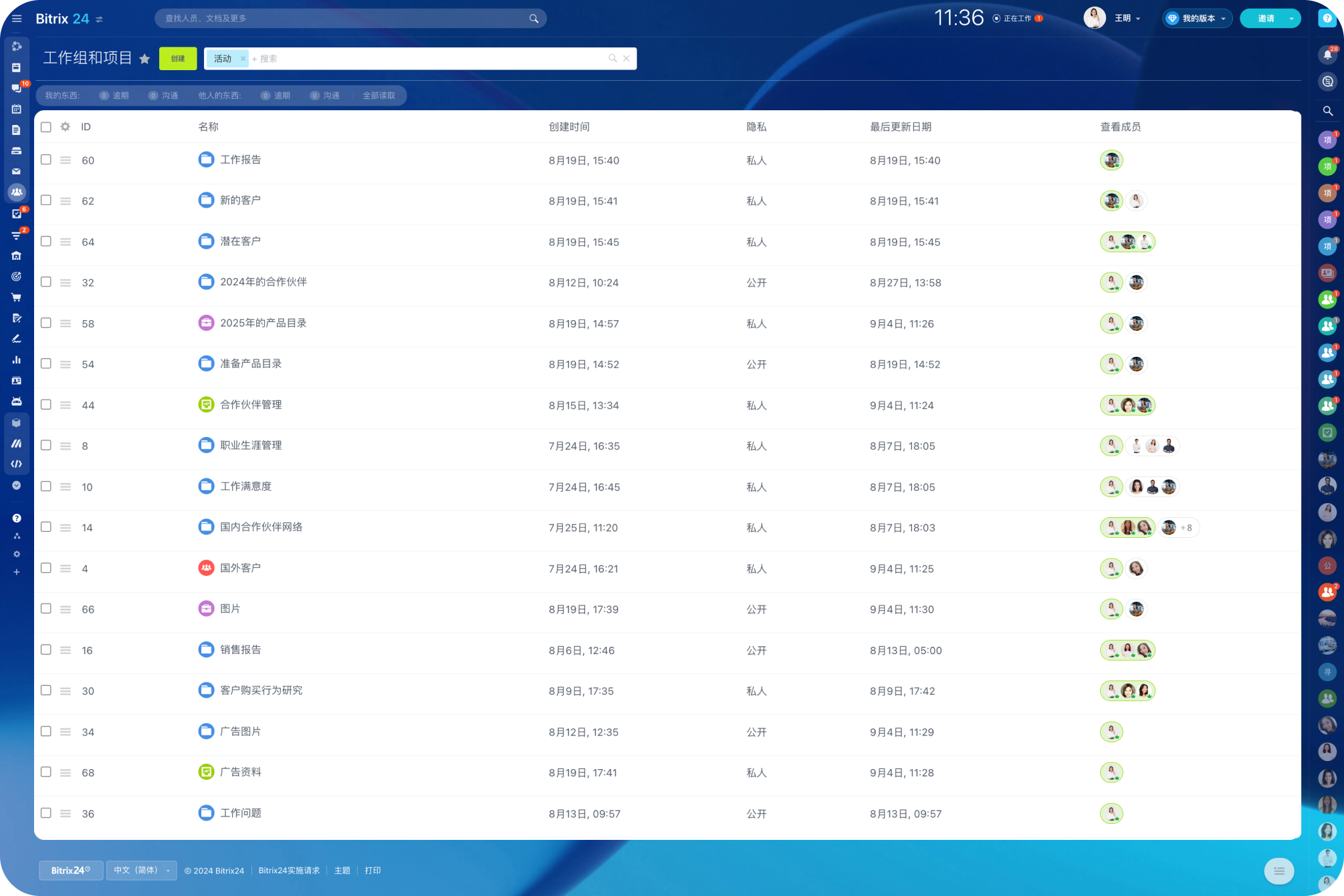 Bitrix24中的工作组是专为处理多个不同项目的团队而设计的,具有他们可能需要的所有在线工作空间工具。