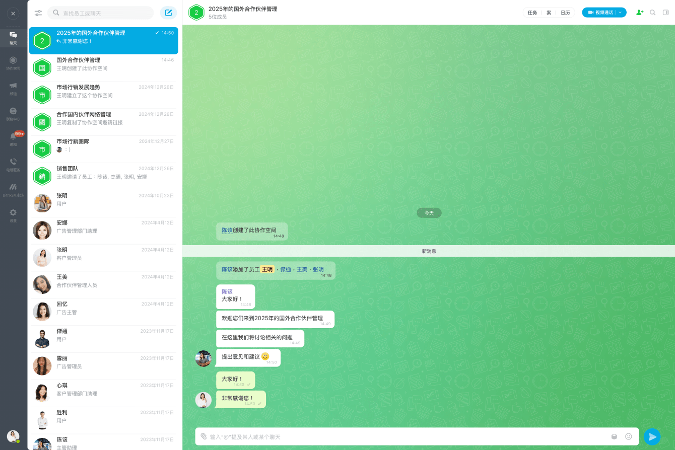 协作空间是一种简单便捷的方式,让您可以与外部用户(自由职业者、承包商、客户等)进行协作。所有与项目相关的聊天、视频通话、文件和任务都保留在您的账户中,这使得控制更加容易,安全性更高。
