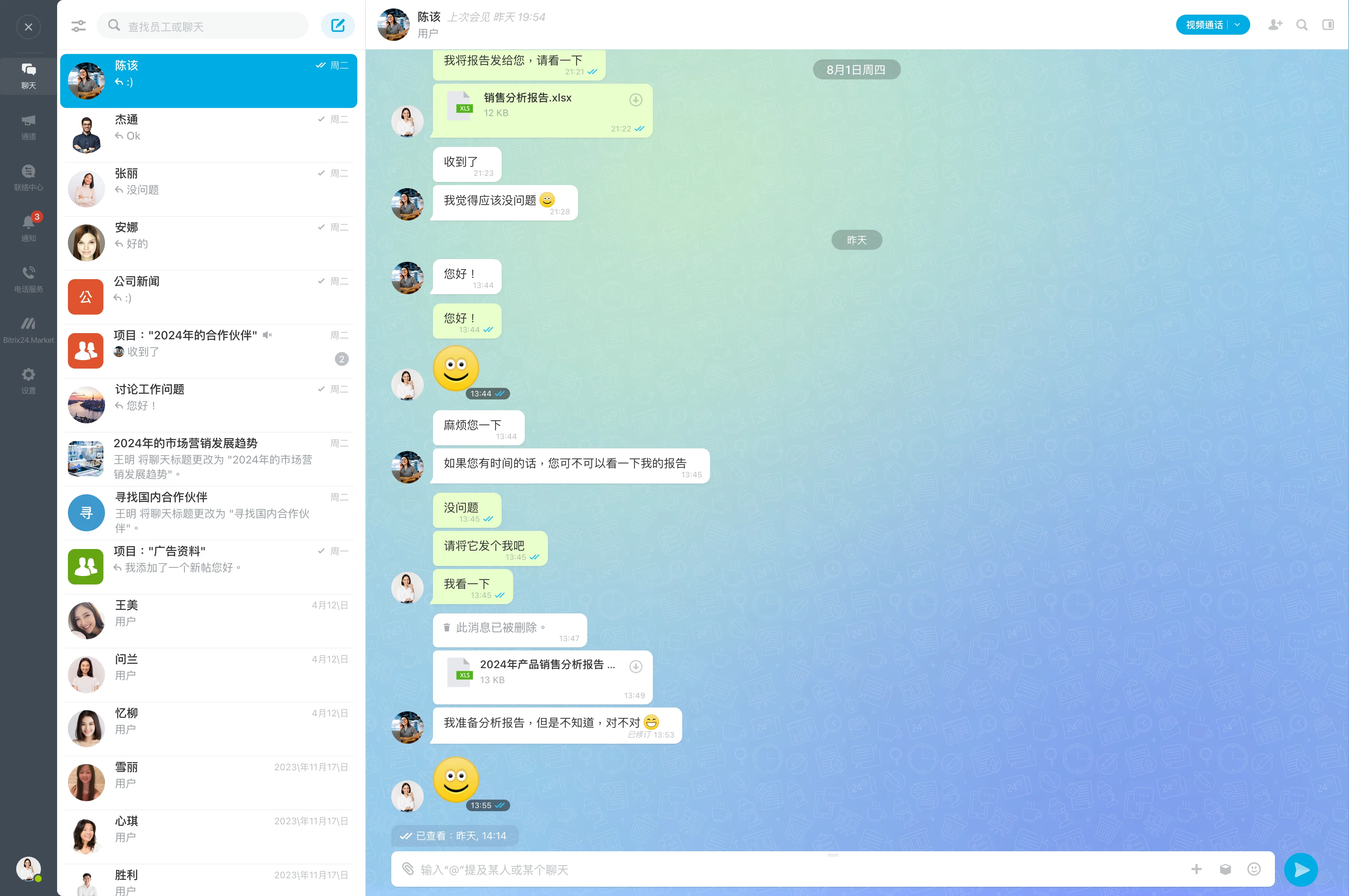 我们的聊天工具让您无需依赖第三方解决方案,就能将所有沟通内容保留于公司内部,确保安全。您可以创建聊天和频道、发起调查、通过协作空间与外部用户(自由工作者、合同方)沟通,分享文件并给予回应。