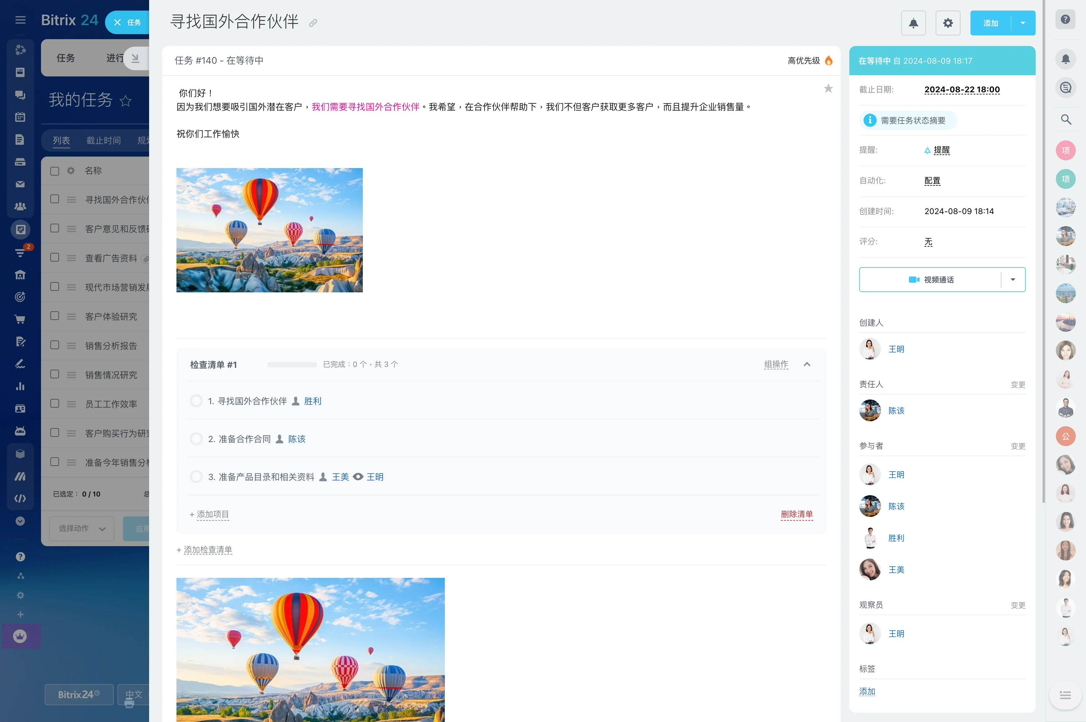 Bitrix24中有4种任务角色:任务分配人、任务被分配人(责任人)、为责任人提供帮助的人(参与者)以及需要知悉信息的人(观察员)。
